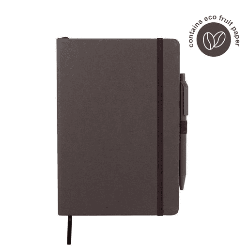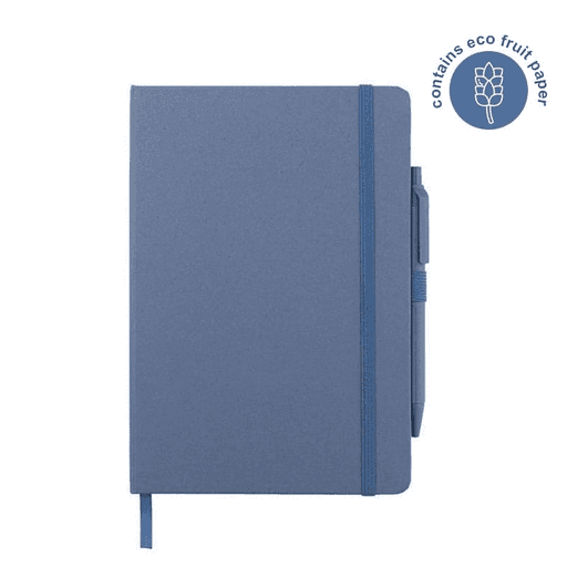 Set of A5 Fruit Paper Hardcover Notepad and Pen in Gift Box. Both notepad cover and pen barrel contains sustainable fruit papers that are created from the residues of agri-food industry (such as cherry orchards). Notepad includes 160 pages of 70g ruled pages. Pen is a ball pen with matching fruit paper barrel. Presented in a sliding gift box.